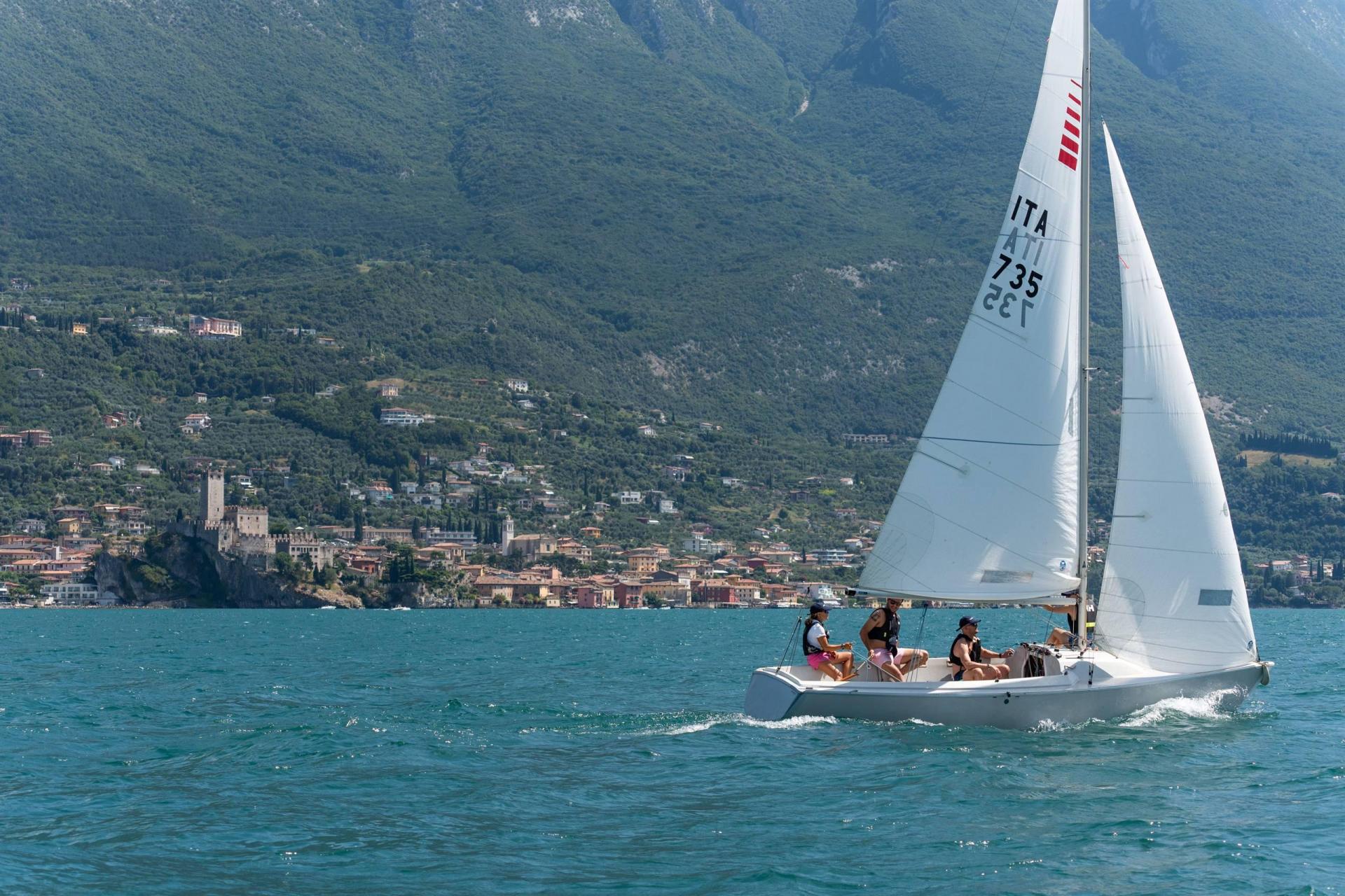 Partiamo dalla Fraglia Vela Malcesine e attraversiamo il lago per arrivare sotto le cascate di Tremosine, e da lì punteremo verso la costa veneta per vedere il castello scaligero e il centro storico di Malcesine dal lago.
